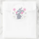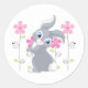 This round sticker is shown in white with a cute bunny and pink flowers print.