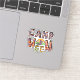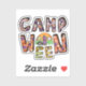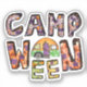 Sticker Halloween Camping - Fun Halloween pun Camp Ween en caractères violets et oranges gras, décoré de crâne et de motifs jack-o’lanterne. Un mignon camper s'installe de façon ludique entre les mots, ajoutant un charme éffrayant. Idéal pour : saison d'Halloween, amateurs de camping, amateurs éffrayants de jeu de mots et aventures d'automne.