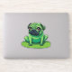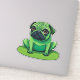 Carlin vert mignon ressemblant à une grenouille assise sur un lilipad. La couleur Arrière - plan peut être modifiée.