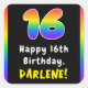 Ce design d'autocollant carré amusant et audacieux à thème d'anniversaire comporte un grand nombre de "16" avec un motif multicolore à spectre arc-en-ciel inspiré de dégradé, avec le message "Happy 16th Birthday," et un nom de destinataire personnalisable. Des autocollants sur le thème de l’anniversaire comme ceux-ci peuvent être utilisés ou distribués à une fête d’anniversaire célébrant le seizième anniversaire de quelqu’un, ou peut-être utilisés pour préparer des invitations ou des cadeaux pour un tel événement. [~Z0000630]