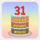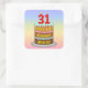 Ce sticker carré amusant et optimisé, sur le thème de l'anniversaire, présente une représentation de dessin animé d'un gâteau d'anniversaire à trois niveaux avec des bougies en forme de chiffres sur le dessus montrant le numéro "31", avec le message "HAPPY 31ST BIRTHDAY", et un nom de destinataire personnalisé. L'arrière - plan dispose d'un motif multicolore pastel en arc-en-ciel inspiré du spectre dégradé. Des autocollants comme ceux-ci peuvent être donnés ou utilisés lors d'une fête d'anniversaire organisée pour quelqu'un qui célèbre son trente et unième anniversaire, ou peut-être utilisés pour emballer des cadeaux ou des cadeaux ou préparer des invitations pour un tel événement. [~Z0000624]
