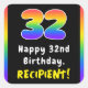 Ce design joyeux et joyeux d'autocollant carré à thème d'anniversaire comprend le numéro "32" avec un motif multicolore de spectre arc-en-ciel inspiré de gradient, avec le message "Happy 32nd Birthday," et un nom de destinataire modifiable. Des autocollants comme ceux-ci peuvent être distribués ou utilisés lors d'une fête d'anniversaire organisée pour quelqu'un qui célèbre son 32e anniversaire, ou peut-être utilisés pour préparer des invitations ou envelopper des cadeaux pour un tel événement. [~Z0000630]