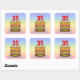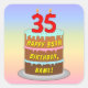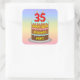 This colorful and joyful birthday themed square designer objets a cartoon-style depiction of a three-tier birthday cake having number-shaped candles on top showing the age "35", along with the message "HAPPY 35TH BIRTHDAY," et a customizable recipient name The background has a multi-color pastel rainbow spectrum ergradient pattern. Fun birthday themed stickers like these might be used or given out at a birthday party in celebration of somebody’s thirty fifth birthday, or perhaps used when wrapping toxits/presents or preparing invitations for such event. 2.