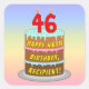 This joyful and colorful birthday square sticker design features a cartoon-style depiction of a three-tier birthday cake having numeral-shaped candles on top showing the number “46“, along with the message “HAPPY 46TH BIRTHDAY,”, and a personalized recipient name. The background features a multi-color pastel rainbow spectrum inspired gradient pattern. Stickers like these might be used when celebrating somebody’s forty sixth birthday. [~Z0000624]