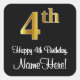 Ce design luxueux, élégant et élégant d'autocollant carré à thème d'anniversaire comporte un grand numéro ordinal "4th" avec une imitation/faux look or, plus le message de voeux d'anniversaire "Happy 4th Birthday," et un nom personnalisé dans une police de style script. Il dispose également d'une arrière - plan de couleur noire. Des autocollants sophistiqués sur le thème de l’anniversaire, comme celui-ci, pourraient être utilisés pour emballer un cadeau ou un cadeau donné pour célébrer le 4e anniversaire de quelqu’un, ou peut-être être remis aux participants à une fête d’anniversaire. [~Z0000517]