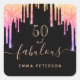 Un autocollant tendance et glamour à 50ème anniversaire. Un arrière - plan noir classique décoré avec des gouttes de parties scintillant irrégulière de couleur arc-en-ciel, la peinture goutte à goutte dans l'or violet, rose et rose. Avec le texte : 50 et fabuleux. Personnalisez et ajoutez un nom. Texte de couleur dorée. Le mot Fabulous est écrit avec un script de style à la main moderne avec des swashes.
