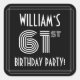 Ce design élégant et 1920-1930 inspiré de soixante-et-unième anniversaire / carré de fête autocollant design comprend un nom personnalisable, un style art déco complexe inspiré numéro "61e", le message "BIRTHDAY PARTY!", et une frontière multi-lignes. L'arrière - plan est coloré en noir par défaut, mais il peut être customisé à une couleur différente, si désiré. Des autocollants comme ceux-ci peuvent être utilisés ou distribués à une fête organisée pour quelqu'un qui célèbre son 61e anniversaire, ou peut-être utilisés pour préparer des cadeaux/cadeaux ou des invitations à un tel événement. [~Z0000617]