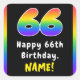 Ce modèle d'autocollant carré à thème d'anniversaire joyeux et optimisé comporte un grand nombre de "66" ayant un motif multicolore inspiré du spectre arc-en-ciel, ainsi que le message "Happy 66th Birthday," et un nom de destinataire modifiable. Des autocollants comme ceux-ci peuvent être utilisés pour célébrer le 66e anniversaire de quelqu’un. [~Z0000630]