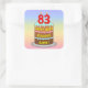 Ce design coloré et amusant d'autocollant carré à thème d'anniversaire présente une représentation de dessin animé d'un gâteau d'anniversaire à trois niveaux avec des bougies en forme de chiffre sur le dessus montrant l'âge "83", avec le message "HAPPY 83RD BIRTHDAY", et un nom de destinataire personnalisé. L'arrière - plan dispose d'un motif multicolore pastel en arc-en-ciel inspiré du spectre dégradé. Des autocollants sur le thème de l’anniversaire, comme ceux-ci, peuvent être donnés ou utilisés lors d’une fête d’anniversaire célébrant le quatre-vingt-troisième anniversaire de quelqu’un, ou peut-être utilisés pour préparer des cadeaux ou des invitations à un tel événement. [~Z0000624]