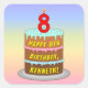 Ce sticker carré amusant et optimisé, sur le thème de l'anniversaire, présente une représentation de dessin animé d'un gâteau d'anniversaire à trois niveaux avec une bougie en forme de numéro sur le dessus montrant l'âge "8", avec le message "HAPPY 8TH BIRTHDAY", et un nom de destinataire modifiable. L'arrière - plan dispose d'un motif multicolore pastel en arc-en-ciel inspiré du spectre dégradé. Des autocollants comme ceux-ci peuvent être utilisés pour célébrer le 8e anniversaire de quelqu’un. [~Z0000624]