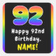 Ce design amusant et joyeux autocollant carré d'anniversaire comprend le numéro "92" avec un motif multicolore inspiré du spectre arc-en-ciel, avec le message "Happy 92nd Birthday," et un nom de destinataire personnalisé. Des autocollants sur le thème de l'anniversaire comme ceux-ci peuvent être donnés ou utilisés à une fête pour quelqu'un qui célèbre son 92e anniversaire, ou peut-être utilisés pour préparer des invitations ou envelopper des cadeaux/cadeaux pour un tel événement. [~Z0000630]
