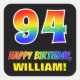 Ce sticker joyeux, amusant et coloré sur le thème de l'anniversaire comporte un grand nombre de "94" et le message "HAPPY BANTHDAY", tous deux colorés avec un motif inspiré par un gradient de spectre arc-en-ciel, avec un nom personnalisable jaune gras. L'arrière - plan est noir de couleur. Des autocollants amusants comme celui-ci peuvent être utilisés pour emballer des cadeaux donnés à quelqu'un pour célébrer son 94e anniversaire, ou peut-être être distribués aux participants à une fête d'anniversaire. [~Z0000480]