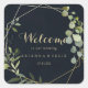 Cet autocollant de carré d'accueil mariage bleu or géométrique est parfait pour un mariage simple. Le design présente de beaux feuilles verts peints à la main dans un arrière - plan bleu foncé, ornant un cadre géométrique doré. Ces étiquettes sont parfaits pour les sacs de bienvenue et les mariages de destination des clients de l'hôtel.