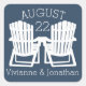 Mariage moderne à thème de plage avec des chaises adirondack en blanc. Personnalisez avec les noms du couple et la date spéciale. Modifiez la couleur arrière - plan selon la préférence.
