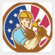 Illustration de style rétro d'un mannequin, constructeur, menuisier ou ouvrier du bâtiment américain tenant un marteau États-Unis d'Amérique étoile étoile spangled bannière étoiles et rayures drapeau à l'intérieur cercle.