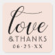 Les autocollants design moderne et chic de mariage rose vif "Love and Thanks" de faveur présentent un design typographique noir élégant avec un script de calligraphie audacieux et un élégant texte personnalisé de date de mariage qui peut être personnalisé.