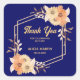 Un autocollant de remerciement d'anniversaire classe et élégant avec une fleur orange et un arrangement feuille marron avec typographie or moderne sur un arrière - plan bleu marine.