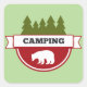 Modern badge style graphic fear silhouette, camping text and a row of fir trees on light green background