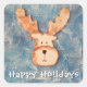 Sticker Carré de Noël de Noël de Noël en hiver. Une tête de renne sur un hiver bleu-blanc et un arrière - plan de glace avec un Happy vacances saluant dans un script moderne. Impression de la tête d'un renne coupée d'une plaque de bois sur un arrière - plan peint. Vous pouvez modifier les salutations de vacances.