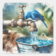 Un oiseau bleu vibrant perche sur un robinet d'eau curieusement inspecter tandis que l'eau coule dans un seau métallique en dessous