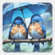 Paire d'oiseaux bleus sous un parapluie bleu dans une tempête de pluie