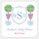 Ce design classique d'autocollants de remerciement présente un simple blason de monogramme à 3 lettres flanqué de chaque côté d'une boule de topiaire peinte à la main dans un pot en forme de jarre à gingembre orné d'un nœud aux couleurs du drapeau américain. Les éléments aquarellés ont été peints par moi sur du papier 100 % coton et numérisés. La forme du blason est l'œuvre d'un autre artiste. Ce design conviendrait également pour une baby shower (où le nom du bébé a été annoncé) ou pour une fête de mariage ou de fiançailles.