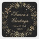 Design festif classique noir et or avec flocons de neige. Modifiez facilement le modèle à vos noms et à votre année désirés. Sticker Carré Bonnes Fêtes en or noir.