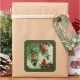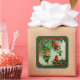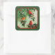 Une paire de cardinaux rouges du nord mâle et femelle perché dans un arbre sacré tandis qu'un troisième cardinal est assis sur un panier en bois tressé rempli de feuilles et de baies fraîchement cueillis. Le tout dans un arrière - plan vert de vacances festif. Image créée à partir d'une peinture à l'huile originale de Crista Forest.