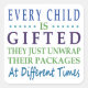Ce design typographique moderne dit "Chaque enfant est doué. Ils déballent leurs cadeaux à des moments différents". C'est un merveilleux encouragement et un rappel que chaque enfant est différent. J'ai conçu ça avec mon fils autiste en tête, ces articles sont parfaits pour les besoins spéciaux ou les enfants du spectre de l'autisme. Ils sont également parfaits pour les enfants typiques !