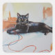 Chat noir provocant nous regarde de sa position confortable sur le lit double avec ses deux boules de fil préférées! Stand de nuit avec lampe dans l'arrière - plan. Une scène de bonheur domestique - au moins pour le chat chaton ! Katherine adore les chats. De la série animale de la collection d'aquarelles de Katherine Foltuz.