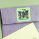 Cet autocollant carré a trois chats noirs aux arcs roses, bleus et verts et des cravates qui jouent des instruments de musique dont un violon, une guitare et un saxophone debout sur une feuille de notes de musique noire sur arrière - plan vert clair.