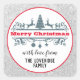 Vacances chic et festives Joyeux autocollant carré de Noël avec une parties scintillant argentée scintille la bordure et l'arrière - plan blanc. Les mots "Joyeux Noël" sont écrits dans un texte rouge gras. L'autocollant est décoré avec un design gris tourbillonnant et soigné, avec un arbre de Noël, deux rennes et des billes. Au bas de l'autocollant se trouvent les mots "avec amour de" en gris, et votre nom de famille en noir.