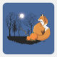 Un renard rouge est assis à côté des citrouilles et des feuilles d'automne. Quelques feuilles d'automne volent vers la forêt derrière le renard