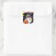 Cet autocollant d'Halloween montre un mignon gnome à barbe blanche portant un casquette violet et vert. À côté de lui, il y a un Jack o' Lantern qui grince. Une lune de croissant jaune est en arrière - plan. Le texte orange en haut dit Happy Halloween. Tout est placé sur un arrière - plan de bord noir en détresse. C'est mignon pour sceller les sacs de gâterie pour enfants !