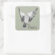 Illustration élégante en nuances de gris d'un atterrissage de colombe depuis le vol, avec le texte "Paix" sur arrière - plan vert sage.