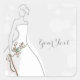Un joli autocollant avec un croquis de mariée en robe blanche avec bouquet sur arrière - plan gris clair avec un arrière - plan en cercle aléatoire. Une touche parfaite comme un sceau d'enveloppe, des sacs de faveur ou des boîtes.
