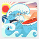 Amusez-Vous En Été, En Bas. Design fantasque dans des couleurs vives, tout ce qui est australien pour le plaisir de la plage : surf, soleil, palmiers, kangourous, plage de sable, et un grand sourire!