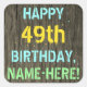 Ce design amusant d'autocollant sur le thème de l'anniversaire comporte un message comme "HAPPY 49th BIRTHDAY, NAME-HERE !", où le nom peut être personnalisé. L'arrière - plan présente un motif rustique, brun, imitation bois de grain. Le texte du message personnalisable est composé de couleurs comme le bleu, le jaune et le vert, et il a un aspect inspiré de celui du lettrage peint et recouvert de pochoirs. Des autocollants comme ceux-ci pourraient peut-être être offerts en cadeau, ou être utilisés comme décorations lors d'une fête d'anniversaire organisée pour quelqu'un qui célèbre son quarante-neuvième anniversaire. [~Z0000296]