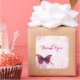 Un joli autocollant de remerciement. Un beau papillon violet peint qui captive vraiment votre attention. Placez-vous sur un arrière - plan délicat qui a une texture aquarelle unique et créative avec des fleurs romantiques rose et jaune pâle.