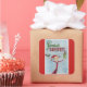 Illustration d'une fille tenant un cadeau dans une main et un oiseau dans l'autre main. Message en afrikaans.