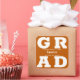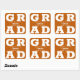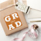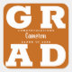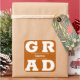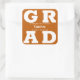 GRAD en lettres blanches en gras remplit les coins de ces autocollants de carré grad arrière - plan orange brûlé. Félicitations au-dessus du nom de votre diplômé et de la classe de ci-dessous. VOIR LA COLLECTION complète de combinaisons de couleurs préfaites, invitations, plaques en papier, serviettes, enseignes et plus dans notre magasin.