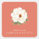 This wedding sticker features a beautifully detailed floral illustration centered on a coral background, creating an elegant and inviting look. The soft white petals are surrounded by muted green leaves, adding a touch of natural charm to the design. Below the flower, the text "thank you" is written in a light sans-serif font, followed by names in a slightly bolder typeface, emphasizing gratitude and personalization. The overall style blends botanical realism with minimalism, making it perfect for expressing appreciation at your special event.
