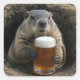 A groundhog is humorously holding a large mug of frothy beer outside its burrow.