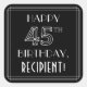 Cette élégante conception d'autocollant carré d'inspiration art déco des années 1920-1930, sur le thème de l'anniversaire, comporte le message "HAPPY 45TH BIRTHDAY", ainsi qu'un nom de destinataire modifiable. Le numéro "45TH" a un look géométrique soigné, et il y a aussi une bordure bordée autour du message de voeux d'anniversaire. Des autocollants sur le thème de l’anniversaire comme ceux-ci peuvent être utilisés ou distribués à une fête d’anniversaire célébrant le quarante-cinquième anniversaire de quelqu’un, ou peut-être utilisés pour préparer des cadeaux/cadeaux ou des invitations à un tel événement. [~Z0000646]