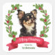 Sur ces autocollants de correspondance de vacances, un portrait aquarelle d'un adorable petit chien noir et tan Chihuahua est entouré d'une couronne de seigle rouge. En bas se trouve une bannière rouge avec votre salutation de Noël personnalisée, et votre signature est en vert sous elle.