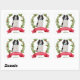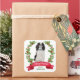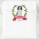 Sur ces autocollants de correspondance de jour férié, un portrait d'un chien Cavalier King Charles Spaniel noir et blanc est entouré d'une couronne de sainte aux baies rouges. En bas se trouve une bannière rouge avec votre salutation de Noël personnalisée, et votre signature est en vert sous elle.