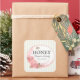 Honey bee drawing in an oval border with misty rose flowers on a beige and white striped background, with editable text to create a vintage rustic honey jar label personalized with the name of your family or beekeeper.