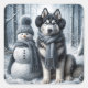 Un Husky sibérien moelleux portant une écharpe et des oreilles est assis à côté d'un bonhomme de neige gai orné d'un casquette et d'une écharpe