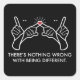 Un ensemble de mains avec des avant-bras signe le mot "différent" en American Sign Language. Un coeur rouge s'est formé là où les deux doigts avant se croisent avec des rayons blancs qui s'en dégagent. Le texte ci-dessous dit en majuscules : "Il n'y a rien de mal à être différent."