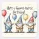 Célébrez dans le style avec cette charmante illustration montrant trois gnomes joyeux tenant des ballons colorés en rouge, bleu et jaune. Le design ludique comprend le texte amusant "Avoir un Anniversaire Gnome-Tastic !" dans une police fantaisiste dessinée à la main sur un arrière - plan crème souple.